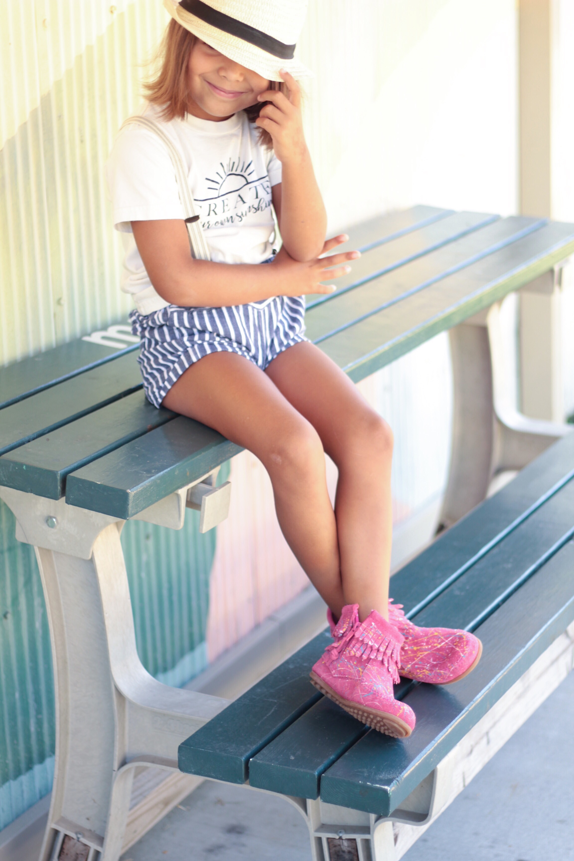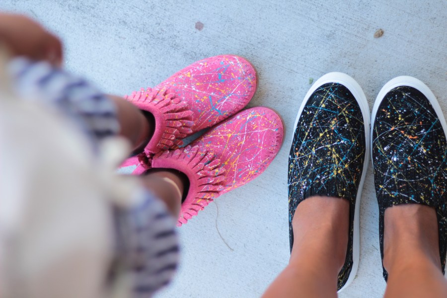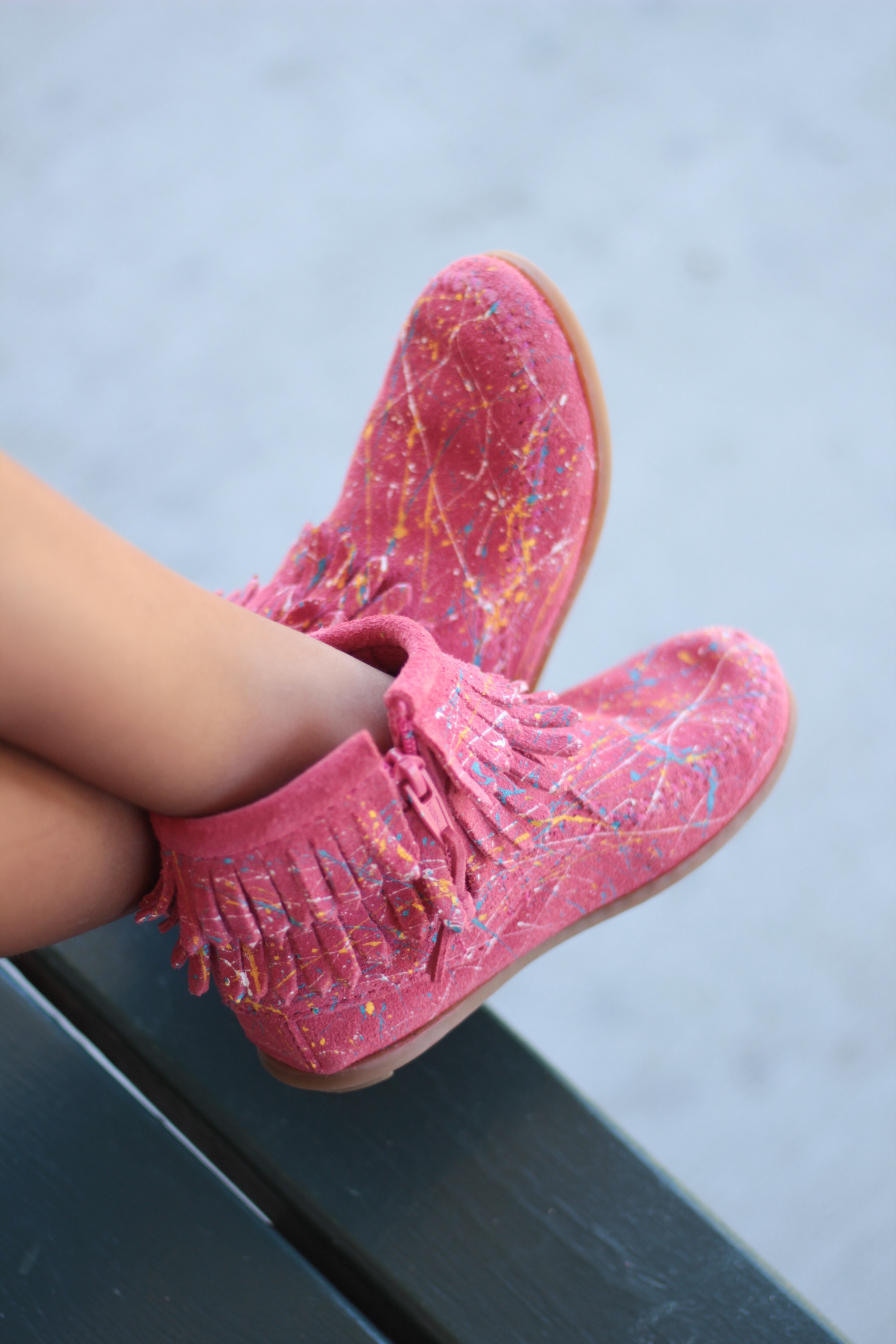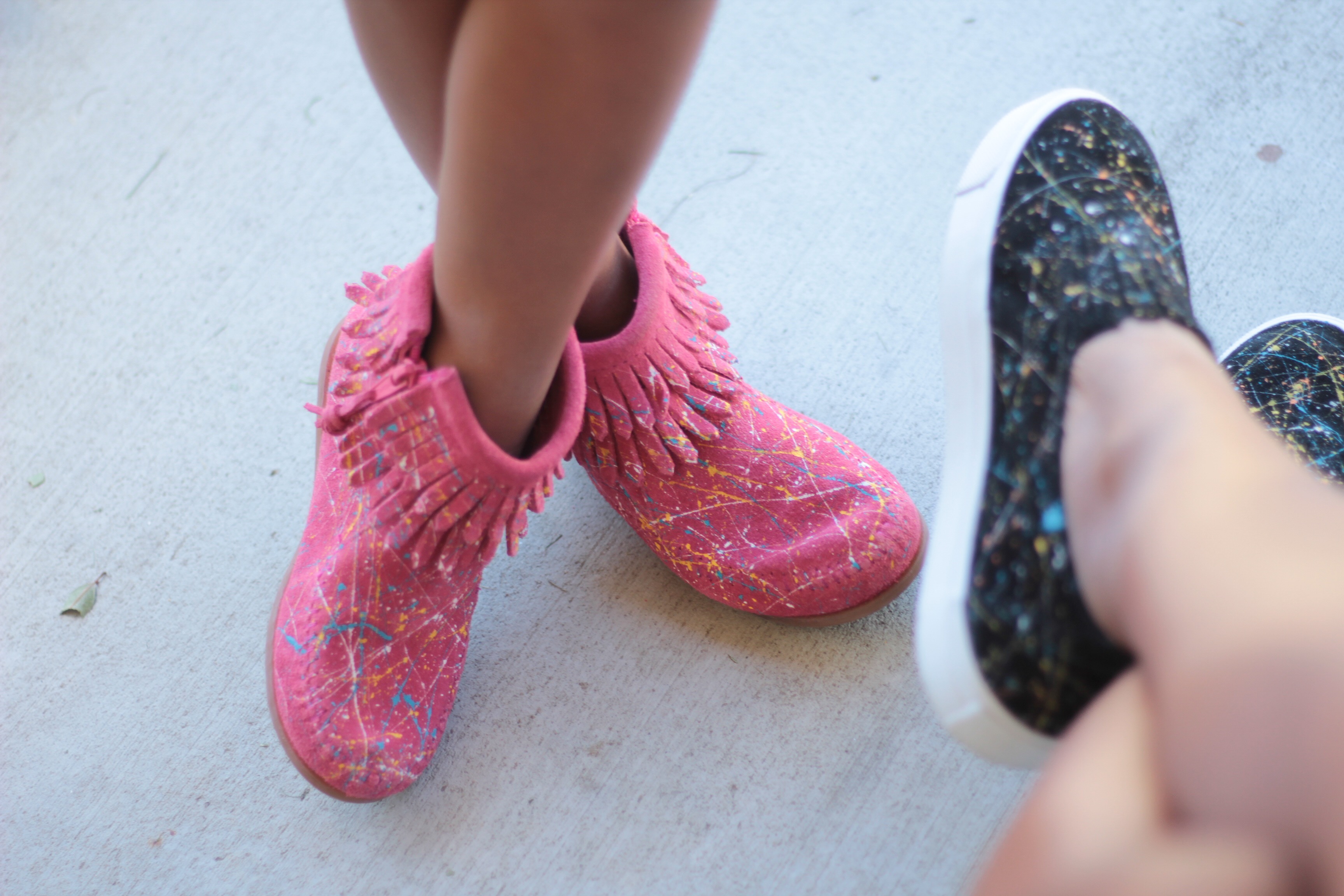 I am so excited to be partnering with Minnetonka on their ‘back-to school give back’ campaign (in collaboration with Lindsay Stewart). Both Minnetonka and Lindsay Stewart of Free Range Mama collaborated on a mommy & me hand painted collection that celebrates young imaginations and the people who help nurture them. The neatest thing about this collaboration was not only do we get to see a fun new twist on those beloved moccs but a portion of the proceeds will go towards funding classroom projects in partnership with DonorsChoose.org