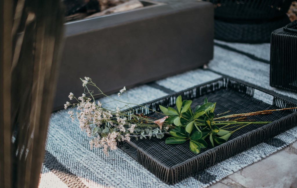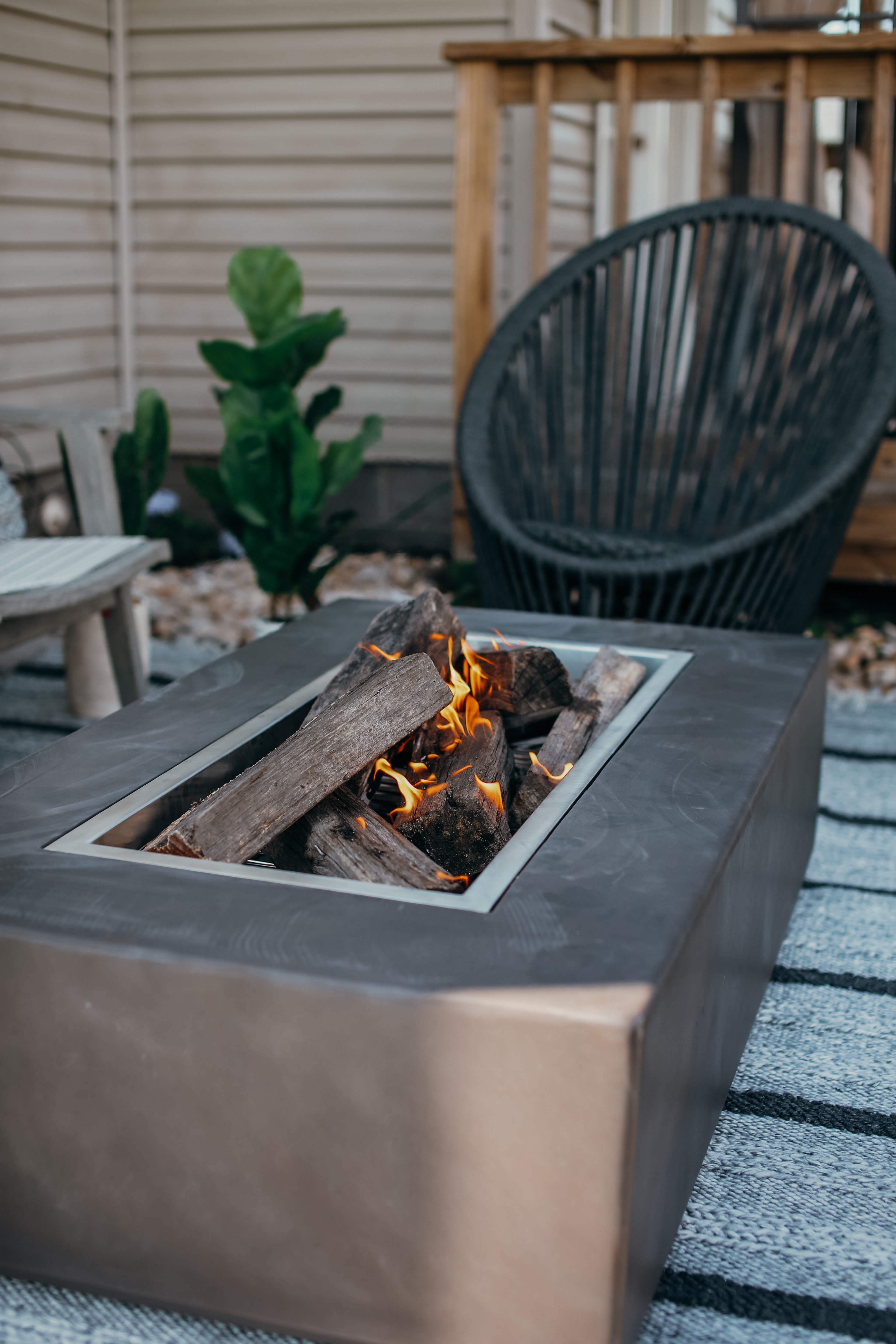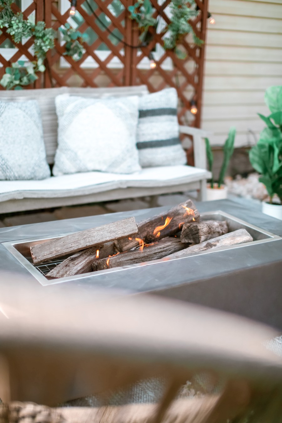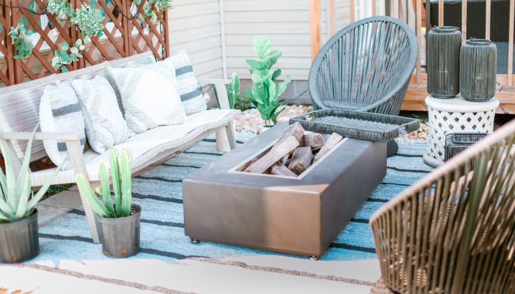 I have to say Donna exceeded my expectations for that area! She knew EXACTLY what I meant by a more bohemian vibe. I was over the moon when I saw her design for our patio. It was so exciting you guys. I have been undecided for years on how to style that terrible space. How to deal with the fact that it was built so close to our bedroom window. I could not believe we were finally going to enjoy sitting around an amazing fire-pit and relax like I’ve always wanted.