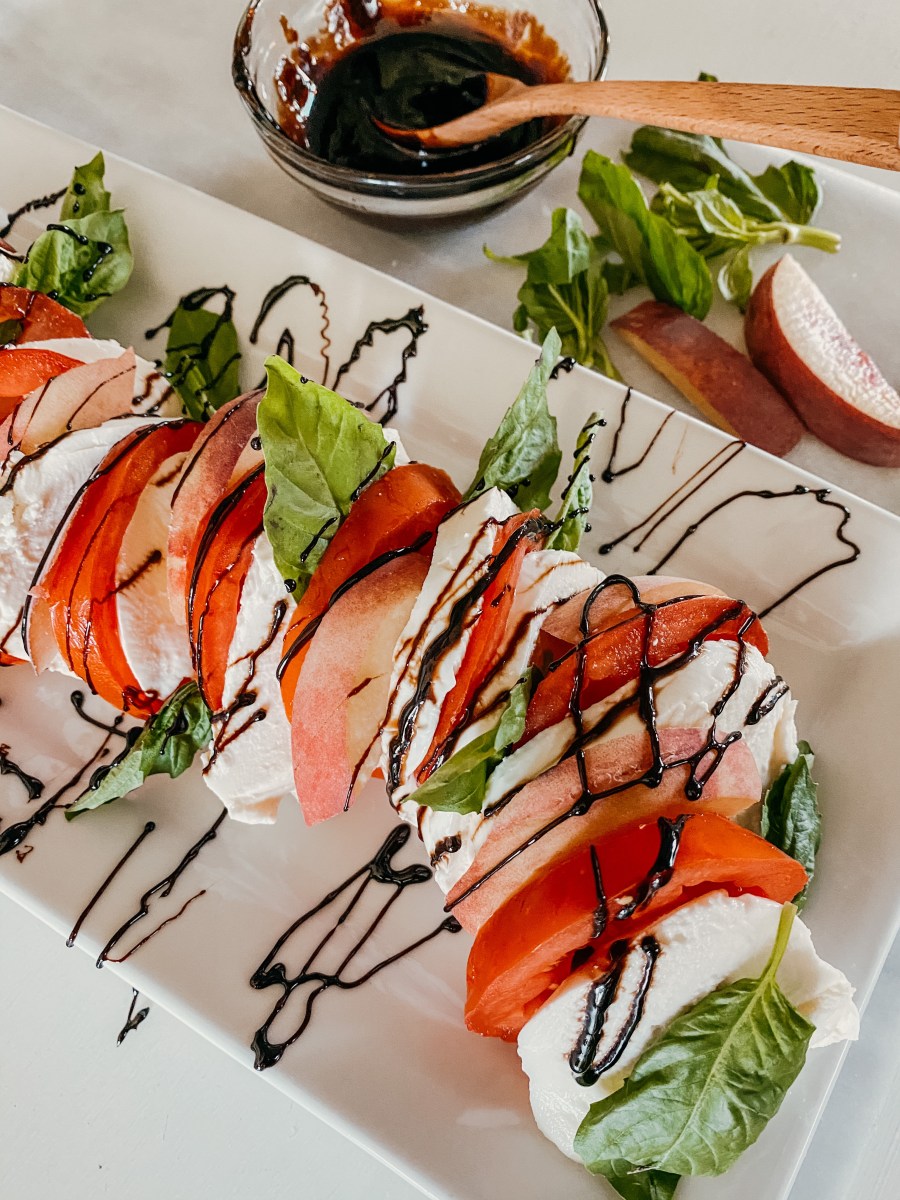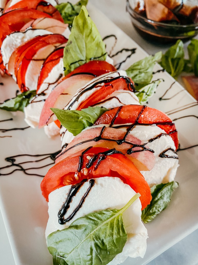 We’re nearing the end of the summer season. While I hate to see it go, I do love to celebrate it! Labor Day is right around the corner and nothing reminds me of summer like a savory Caprese salad. Since peaches are another summer favorite, I enjoy throwing in a few wedges into the salad as well.
