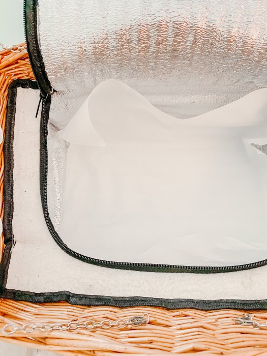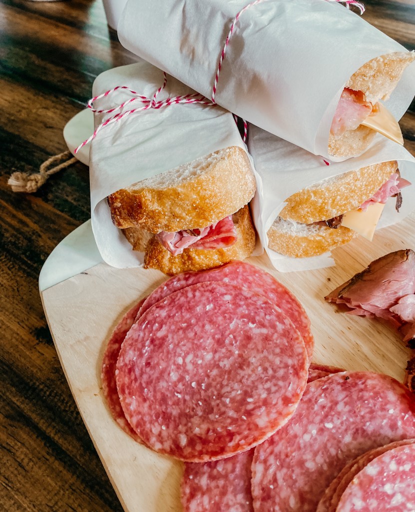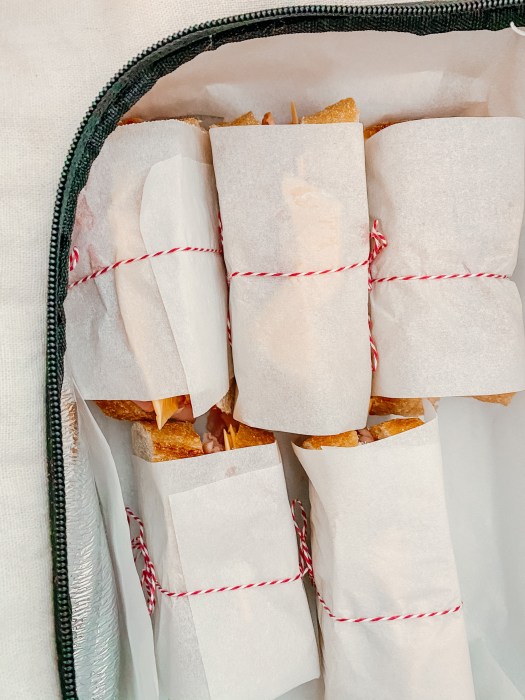 One “picnic hack” I’ve learned (from bad experiences) is to line things with parchment paper! Soggy sandwiches are THE worst and that was my issue every time. I used to place our sandwiches in plastic baggies; seemed the most logical to me. The thing is- moisture seeps through and that’s when you’re stuck with a soggy sandwich. The solution to that is to wrap individually wrap them with parchment paper. Twine rope/ butchers string works well to secure it, and it happens to look pretty too. Win/win!