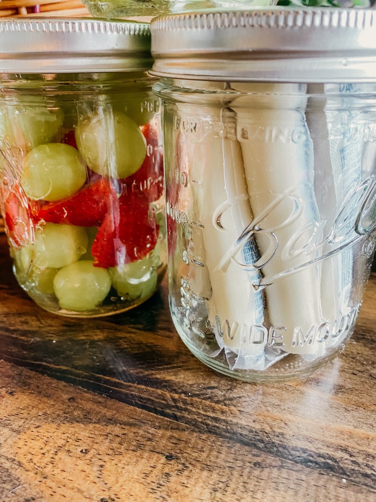 Slicing/peeling fruit at a park is not the most fun process, am I right? This is why it’s convenient to have it all ready to go. I like to fill up mason jars for each kid to snack on. I precut the strawberries, pull the grapes off the vine, and have orange slices all nice and packaged. That way it’s easy to distribute and snack on without worry.