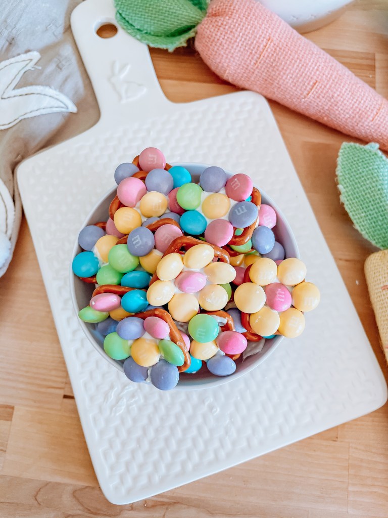 Place cookie sheet in over for 2 minutes. Remove and transfer to dish. Let cool for 4-5 seconds before decorating with m&m’s.