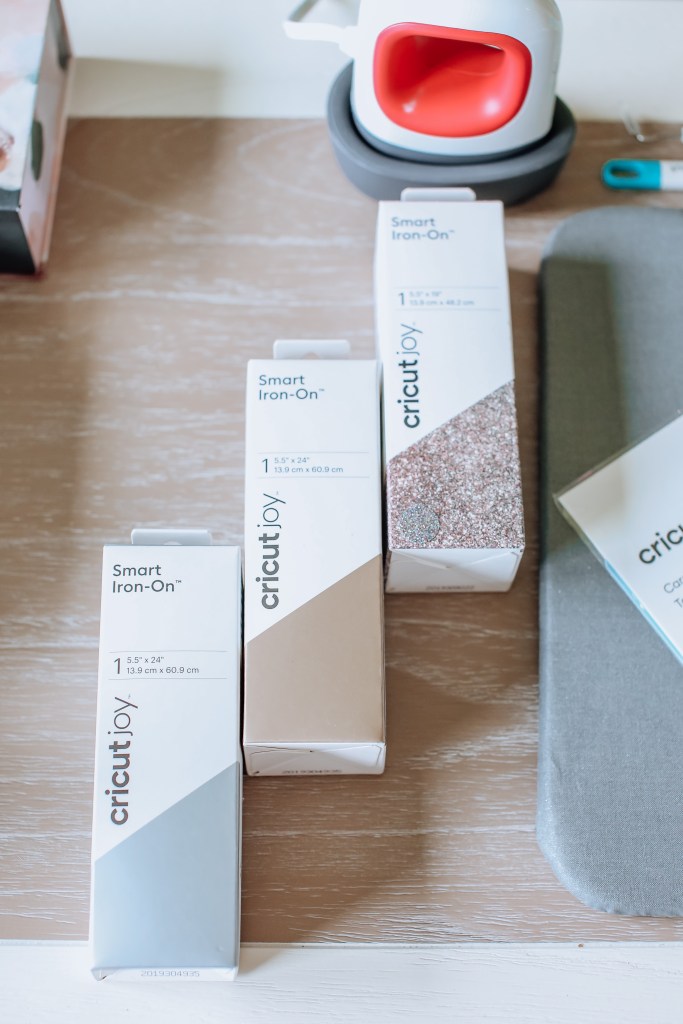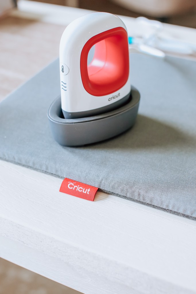 Time to iron on t-shirt! This is my favorite step because I’m that much closer to the finished product AND truth be told, I’m obsessed with the Cricut easypress mini. I love using the easypress mini because it’s the perfect size for the Cricut Joy projects. Also, the EasyPress, Protective Resistant Mat for Heat Press Machines is great to work on. If you don’t have a crafting space and need to work on other surfaces that you’re scared to damage- this is a great option!