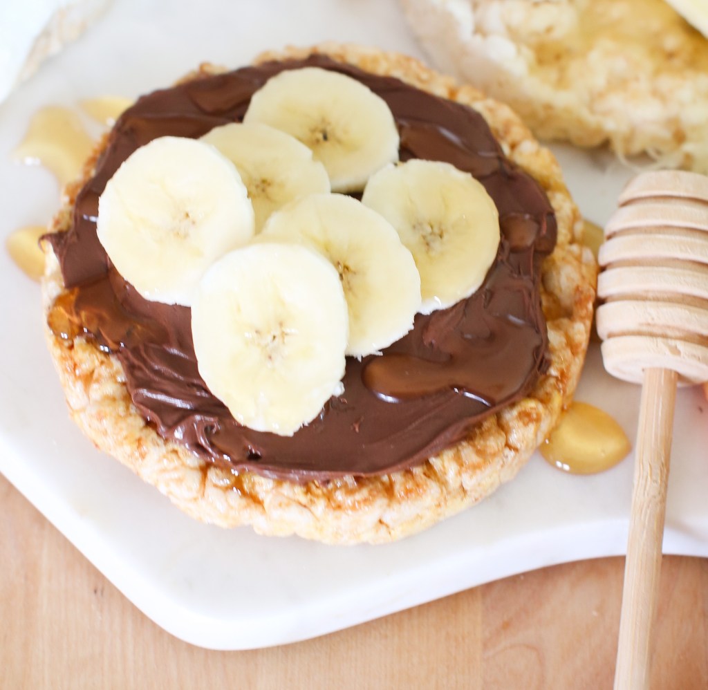 Spread Nutella on rice cake. Place banana slices on top and drizzle with honey.