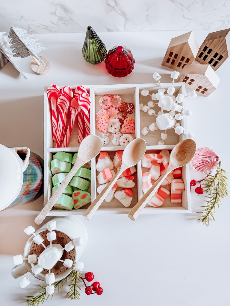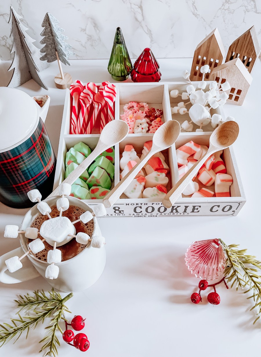 Today I’m sharing how we set up our little hot chocolate station. It’s mostly marshmallows and candy cane stirrers but it’s a fun new spin on how to set it up 🙂