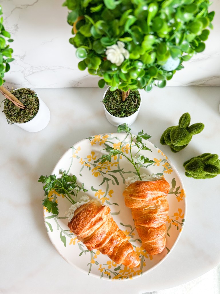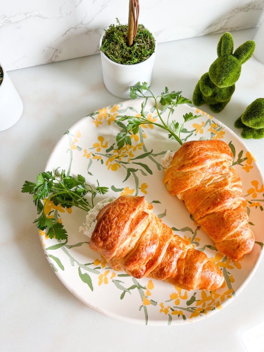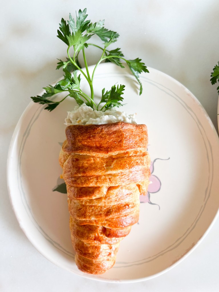 Fill your crescent roll with your favorite side dish and top with a leafy herb to resemble a carrot stem. That’s it! Now you have a very fun and delicious snack to share on your table!