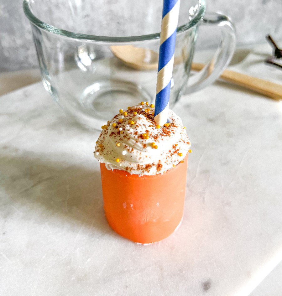 While you wait, make your chocolate “foam” topper. This is SO simple and the cutest little addition to give it a “PSL” vibe. Melt white candy melts and using a spoon place a dollop of chocolate onto parchment paper. Shape your dollop with spoon to mimic a foam swirl look. Once you’re happy with the shape, stick in half of a paper straw, sprinkle cinnamon dust, and sprinkles. Allow topper to dry on parchment paper before use.