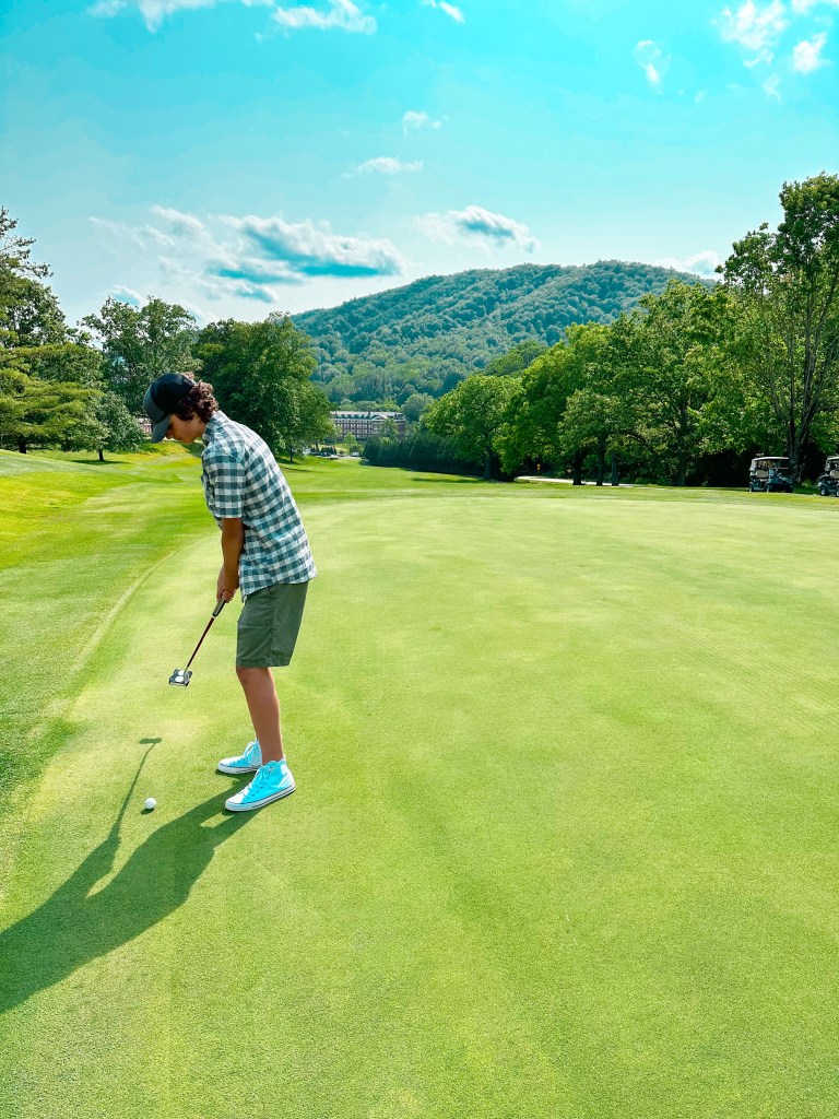 After a full morning of fishing, we freshened up and enjoyed the daily tea time at the resort. Followed by a family game of golf. The Omni Homestead is known for their lush golf courses so we wanted to see for ourselves what the fuss was all about. Again, it did not disappoint! Even though our golf skill level is non existent with exception of my husband and maybe the boys, ha, we had such a great time practicing our swing and driving through this beautiful course. Golf clubs and golf balls were provided, so for those wondering, there are rental options. By the way, the golf carts are elite! The cooler is stocked with cold waters and the touch screen gps map of the course was incredibly helpful and useful throughout the day to literally keep us on track. It was a 10/10 family activity and I would highly recommend you give it try.